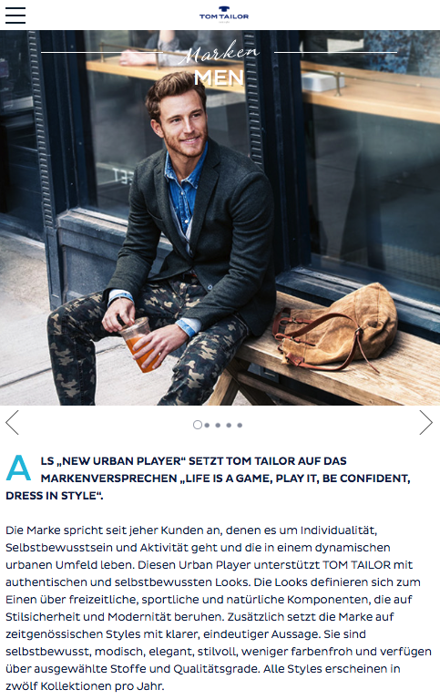 Die Pfeile rechts und links zeigen bei Tom Tailor deutlich, wie man navigiert. Die Punkte sind als Positionsanzeiger OK, aber zur Steuerung viel zu klein – mit dem Finger sind sie nicht zu treffen.