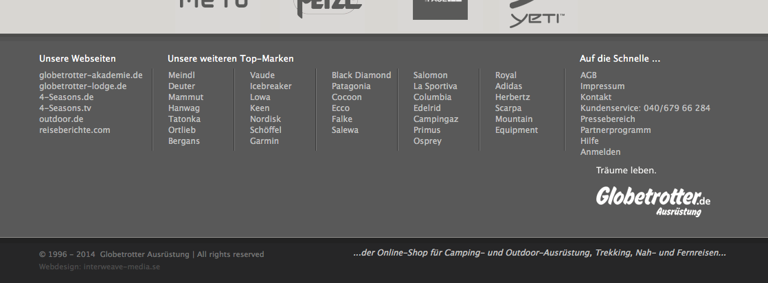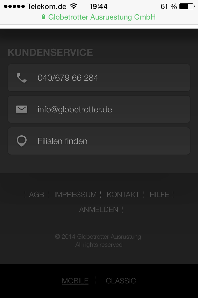 Das Seitenende von globetrotter.de auf dem Smartphone. Nur der Kontrast könnte noch etwas höher sein – Dunkelgrau auf Schwarz ist nicht für jeden gut lesbar.