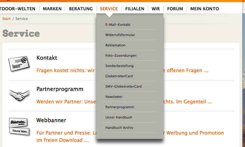 Der Sport- und Ausrüstungsshop Globetrotter hat im Hauptmenü einen Bereich „Service“, direkt neben „Beratung“. Ein Klick auf „Service“ öffnet die gleichnamige Seite. Diese enthält offenbar eine Navigation mit Icons und kurzen Erklärtexten. Allerdings stehen hier andere Punkte als die im Service-Popup-Menü, was etwas verwirrt.