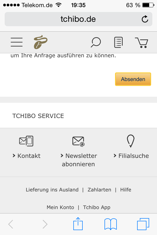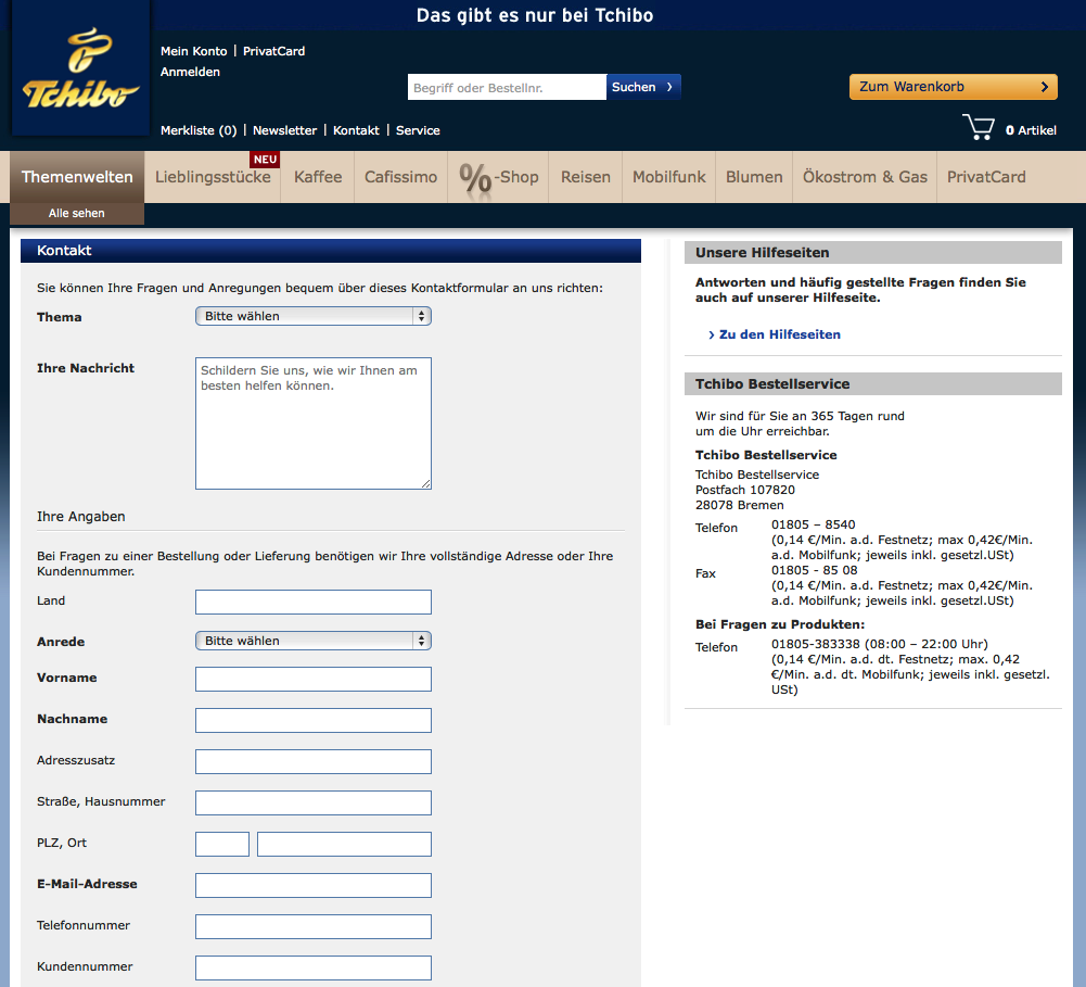Bei Tchibo stehen im Header oberhalb der Hauptnavigation sowohl „Kontakt“ als auch „Service“ – wer weiß, was der Unterschied ist?