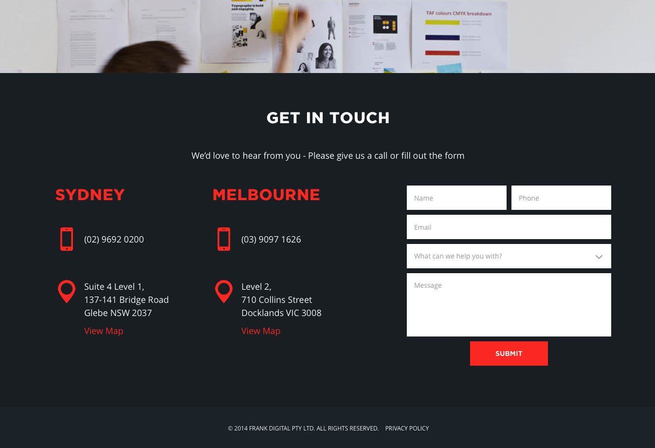 Wer als Dienstleister explizit Kontakt sucht, der kann den Footer ganz diesem Thema widmen wie hier die australische Agentur Frank Digital.